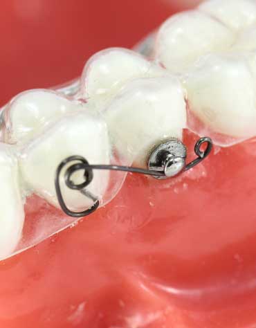 在需要移动的牙齿上安装高附件,佩戴正畸牙套, 附着于牙套内的钢丝形成有效支抗 高附件控根移动磨牙。